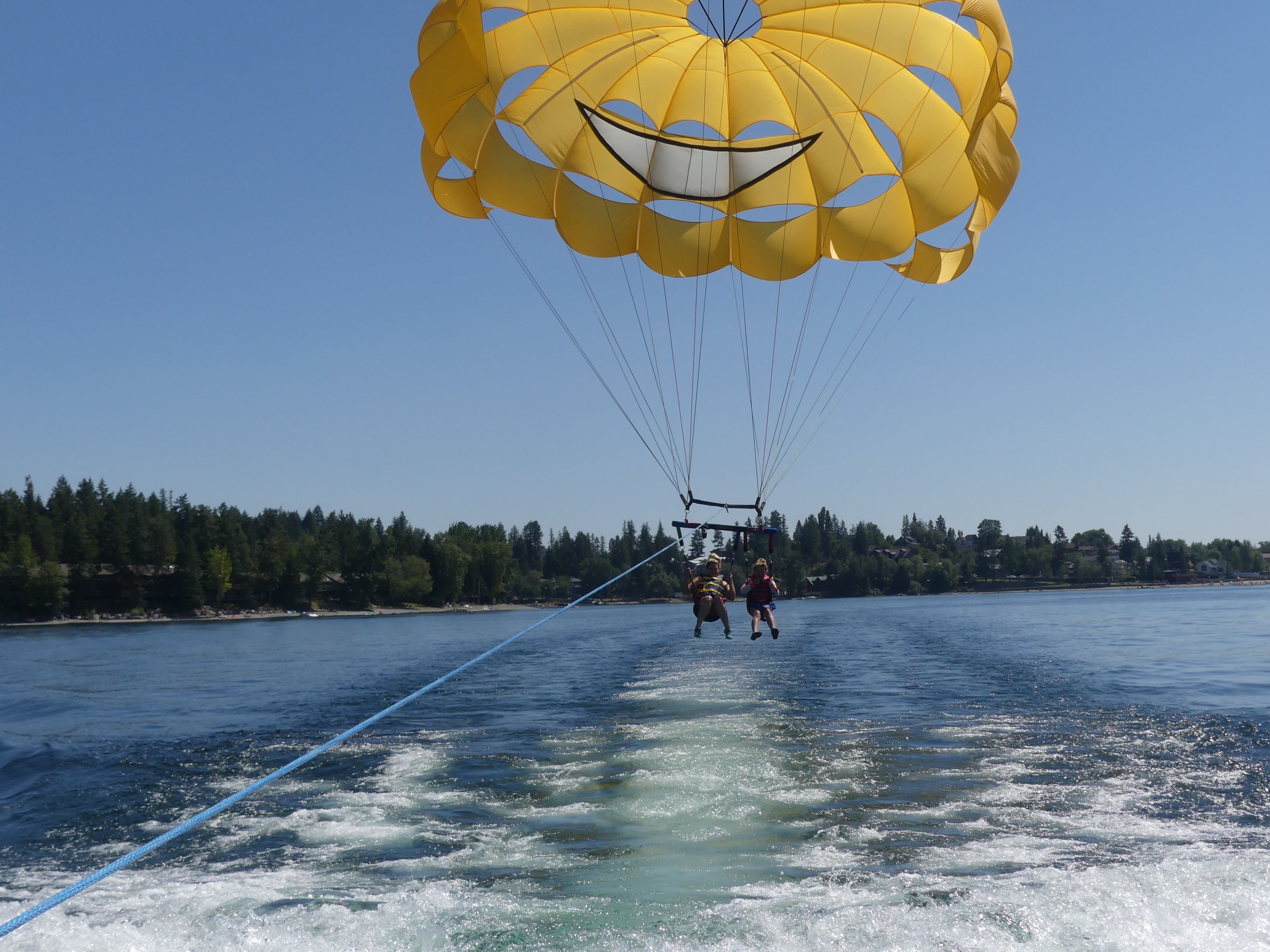 Smiling parasailers soaring over Flathead Lake